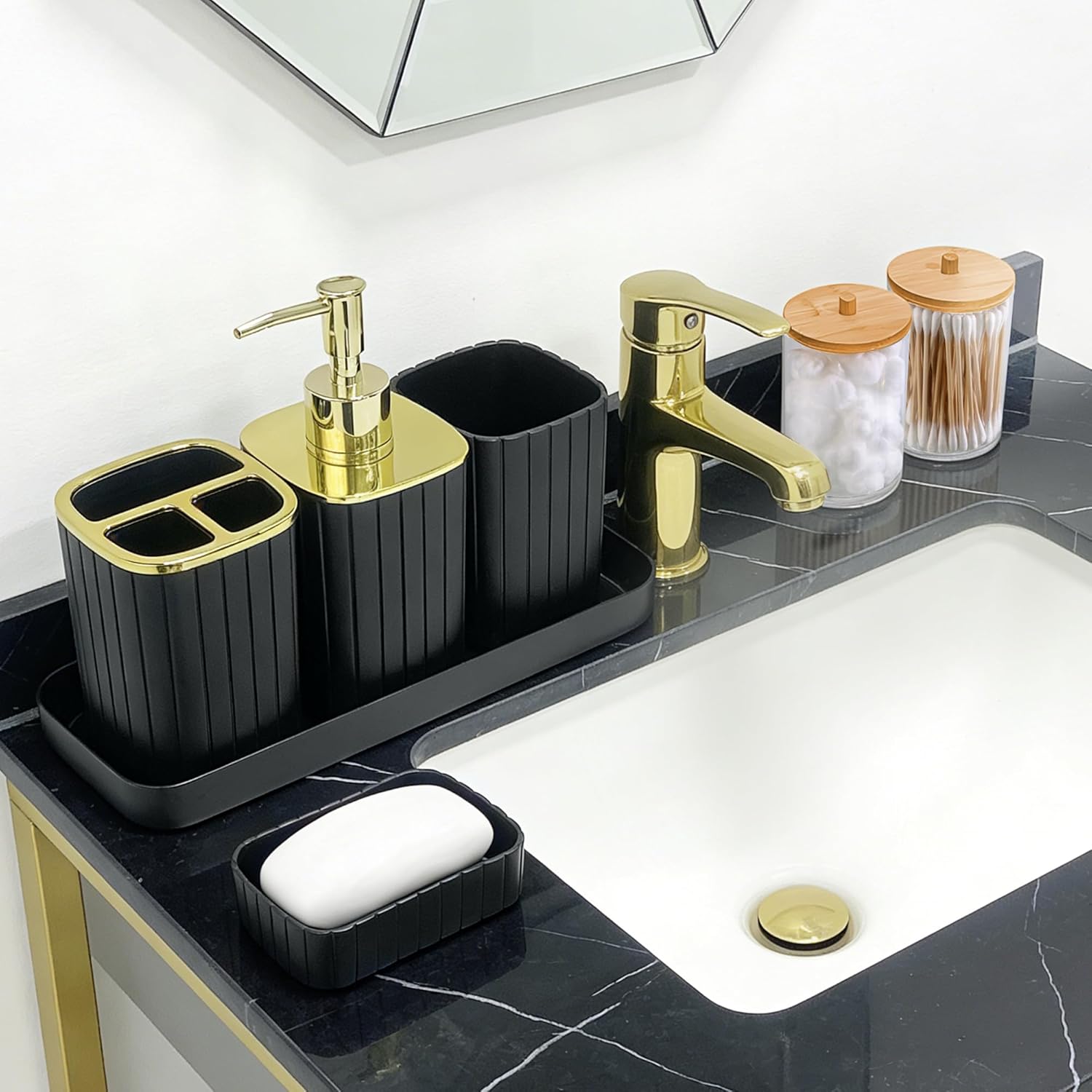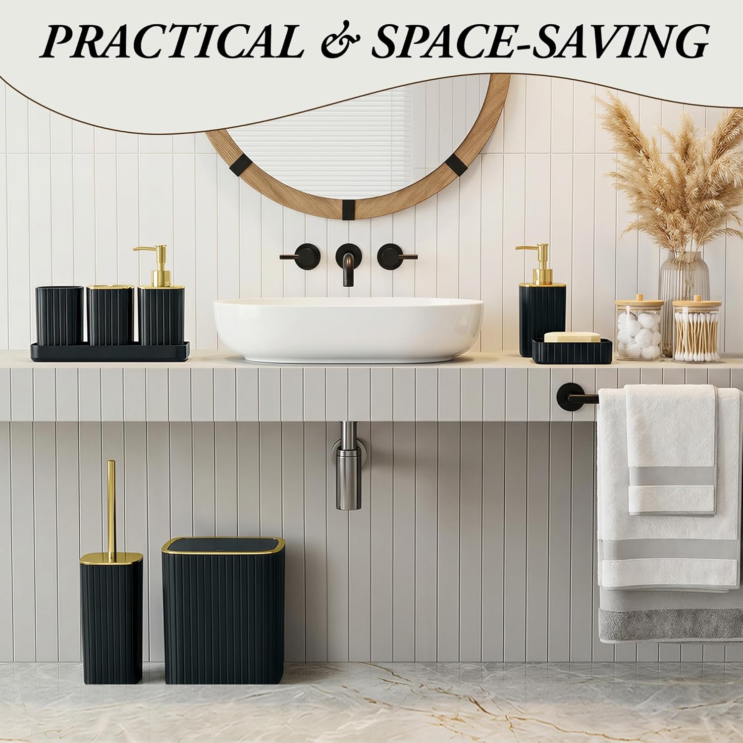 【 PRACTICAL & SPACE-SAVING 】:Designed for final comfort, this set consolidates all of your lavatory necessities. It successfully declutters your countertop, sink space, and bathroom space, offering a devoted organizer for every little thing from cleaning soap and cotton swabs to toothbrushes and waste. Obtain a tidy, organized, and practical lavatory with minimal effort.