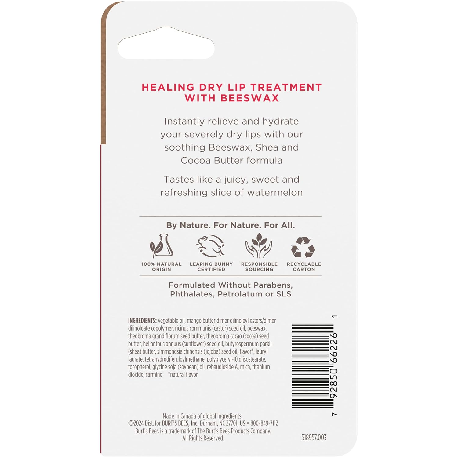 Burt’s Bees Watermelon Rescue Lip Aid Lip Balm immediately hydrates and replenishes extraordinarily dry lips. Formulated with responsibly sourced beeswax, shea butter and cocoa butter, this lip moisturizer instantly relieves dryness and helps defend lips’ pure moisture barrier. The light-weight, non-sticky beeswax formulation is straightforward to put on, and it options the scrumptious style of a juicy, candy and refreshing slice of watermelon. Formulated with out parabens, phthalates, petrolatum or SLS, this hydrating flavored lip balm is 100% pure origin to rejuvenate and beautify lips with clear substances. For aid of dry lips regardless of the place you’re, simply tuck a tube of this pure origin lip balm into your pockets or purse to maintain nurturing lip care at your fingertips. Use Burt’s Bees Lip Balm to make lips really feel their greatest. Burts Bees is the No. 1 dermatologist-recommended pure skincare model (1). (1) Based mostly on a November 2023 NielsenIQ nationwide survey of U.S. Dermatologists