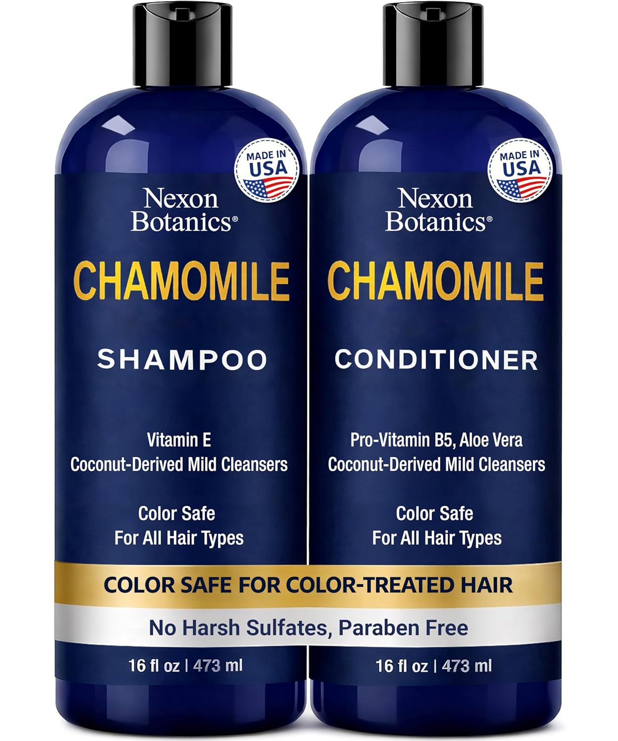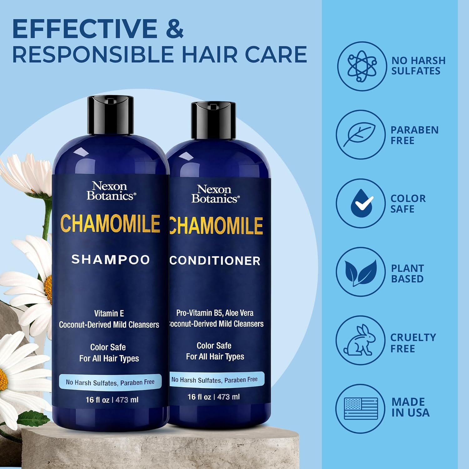 Made in USA: Paraben-free and cruelty-free chamomile shampoo and conditioner set, proudly made within the USA with plant-based substances for a mild but efficient hair care routine for women and men.