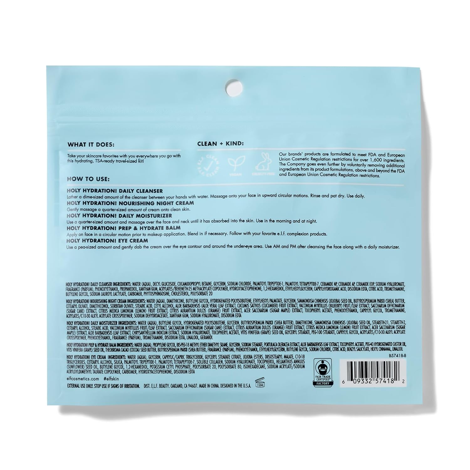 SKINCARE ON THE GO: The e.l.f. Jet Set Hydration Equipment incorporates all your skincare favourites in a TSA-ready travel-sized equipment. The equipment features a Cleanser (30ml), Hydrating Balm (6g), Moisturizer (25ml), Eye Cream (7g) and Night time Cream (15g).
