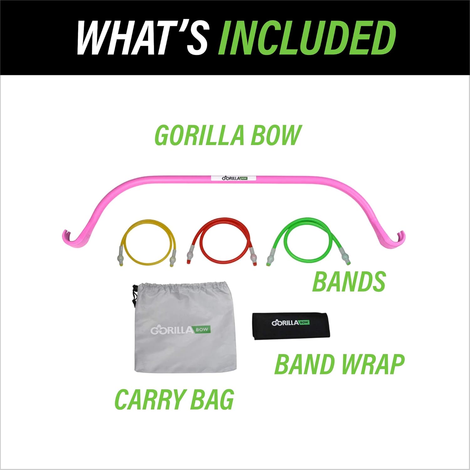 What’s Included – Lite Bow, Pink, Base Bundle features a full-length 41.5” Bow; (3) Double-Wall Gorilla Bands ((1) 30 lb., (1) 20 lb., (1) 10 lb.); Band Wrap; 30 Days of Gorilla Bow All-Entry Membership