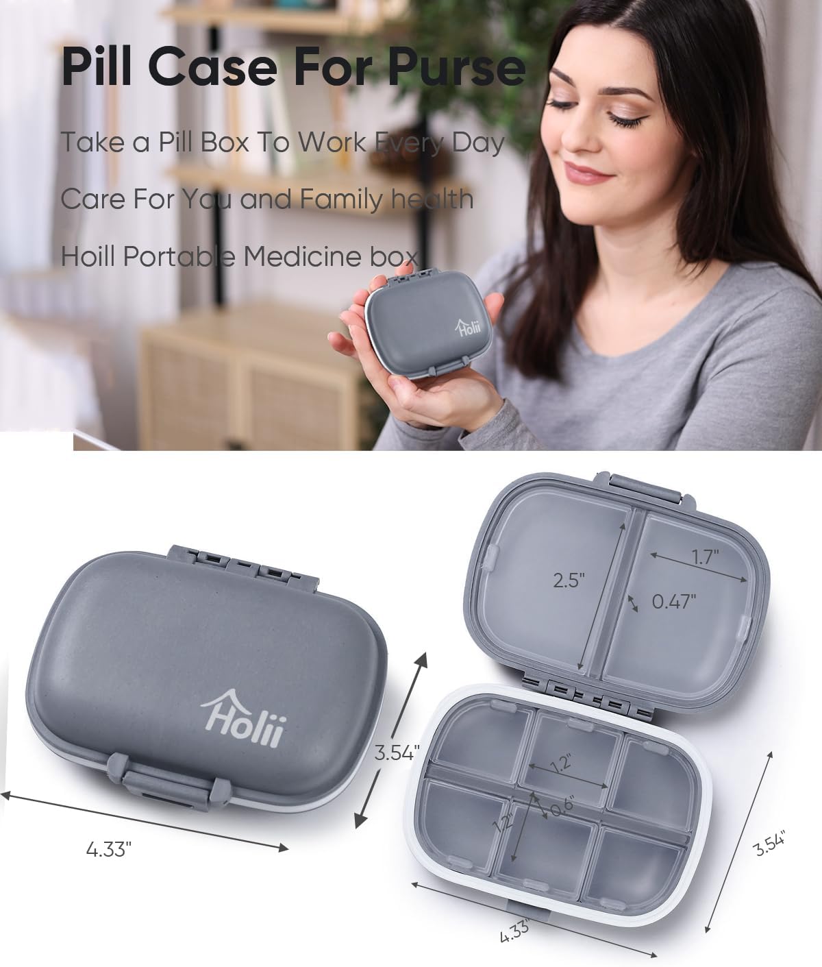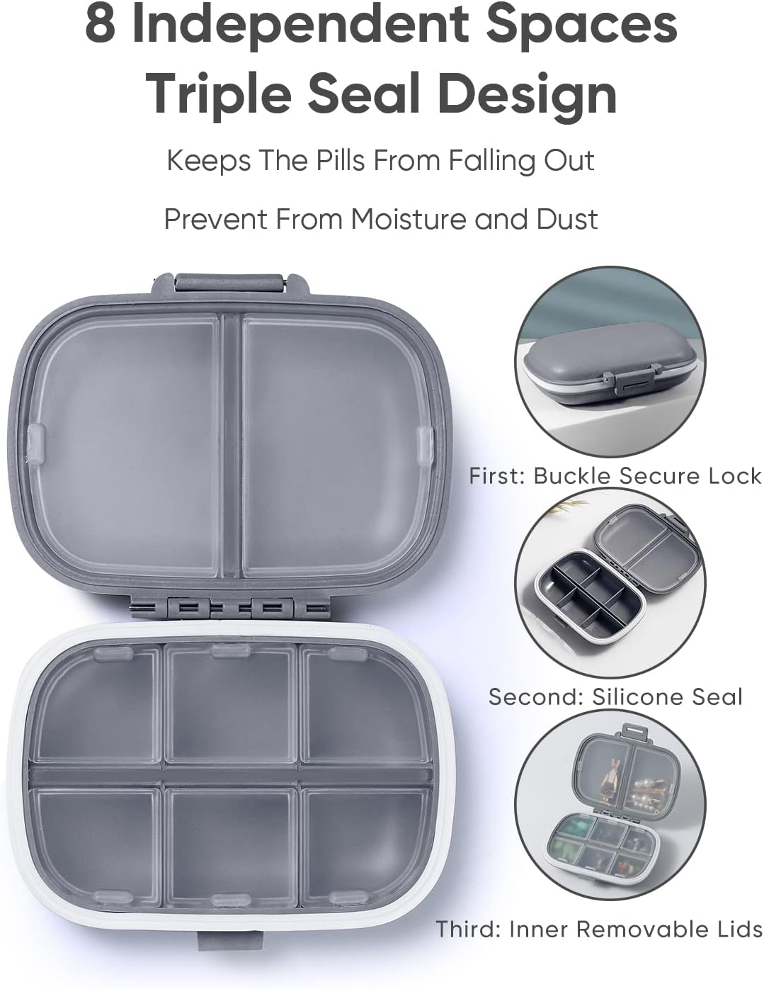 Holii Journey Capsule Organizer, 8 Compartments Moveable Capsule Case, Each day Capsule Field to Maintain Nutritional vitamins, Small Capsule Container for Pocket Purse Drugs Organizer(Grey)