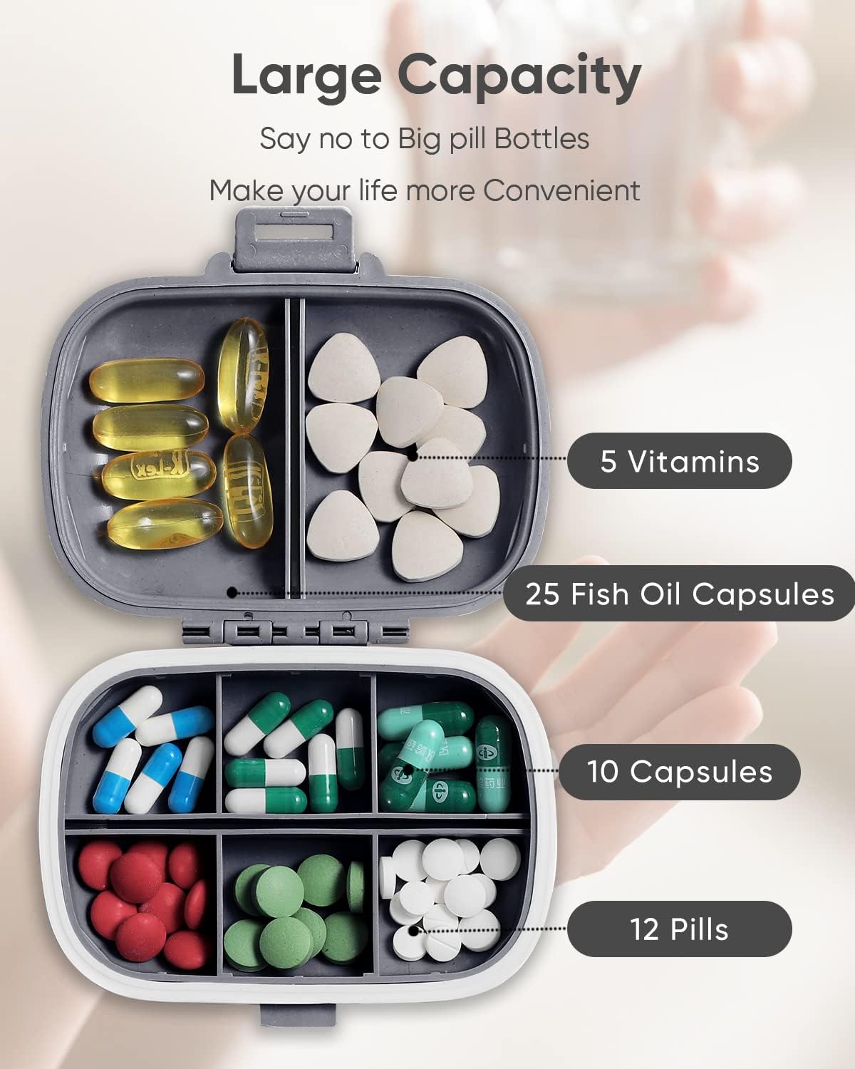 Giant Capability: The day by day tablet case has 8 compartments (6+2), 6 small chambers for little tablets and a couple of giant chambers for nutritional vitamins. Capsules of various sizes are positioned in compartments of various sizes