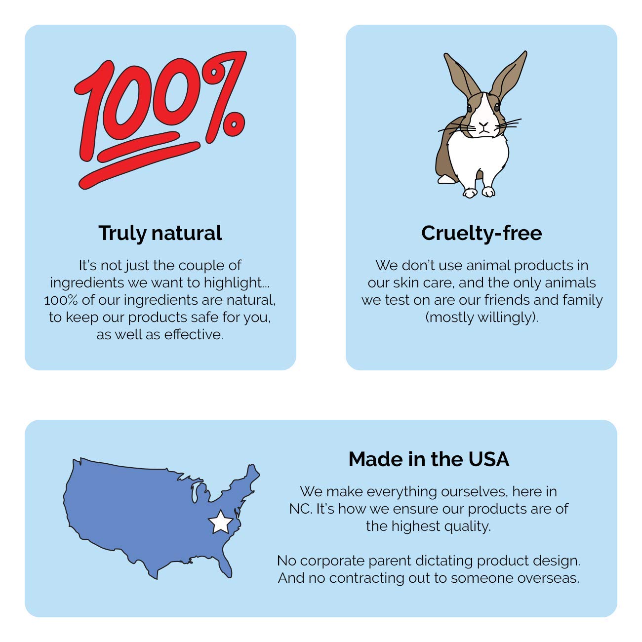 All of our merchandise are made by us, within the USA, out of 100% pure components. They’re each extremely efficient and protected sufficient to eat. Yep, you learn that proper. Pores and skin is the biggest organ of our our bodies, and a whole lot of what we placed on it will get absorbed into our bloodstream. So we determined that if we are able to’t eat it, we shouldn’t feed it to our pores and skin. Meaning no chemical compounds, no parabens, and nothing artificial. We’re rethinking skincare: from how we supply our components and formulate our merchandise to how we bottle them (to keep away from harsh preservatives) and get them to the doorstep.