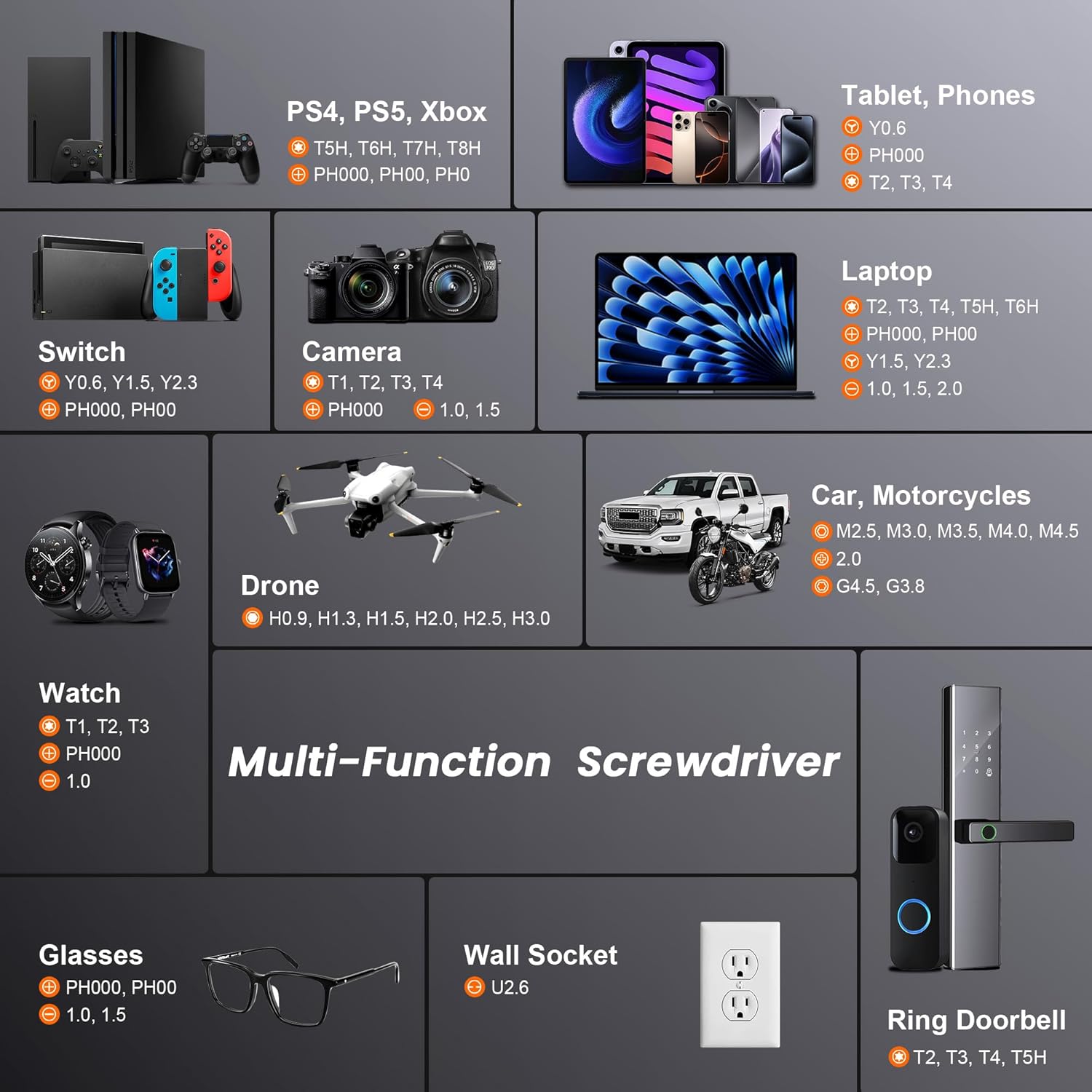 【59 in 1 Precision Screwdriver Set】The screwdriver set accommodates 44 screwdriver bits, Phillips PH000,PH00,PH0,PH1,PH2; Flathead -1.0, -1.5 -2.0,-3.0; Torx T1 T2 T3 T4 T5, Torx safety TR6 TR7 TR8 TR9 TR10 TR15 TR20; Triwing Y0.6, Y1.5. Y2.3, Y3.0; Pentalobe P2(0.8) P5(1.2); Triangle 2.3; U-type U2.6; H-type: H0.9, H1.3, H1.5, H2.0, H2.5, H3.0; MID-type: MID; Sleeve: M2.5, M3.0, M3.5, M4.0, M4.5, Cross 2.0, G3.8, G4.5