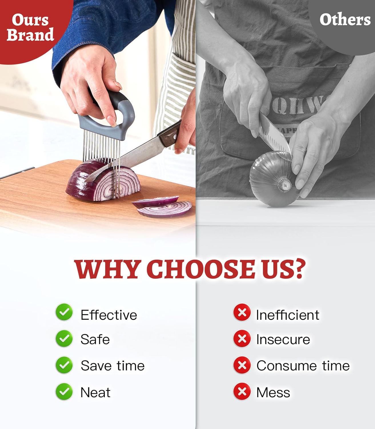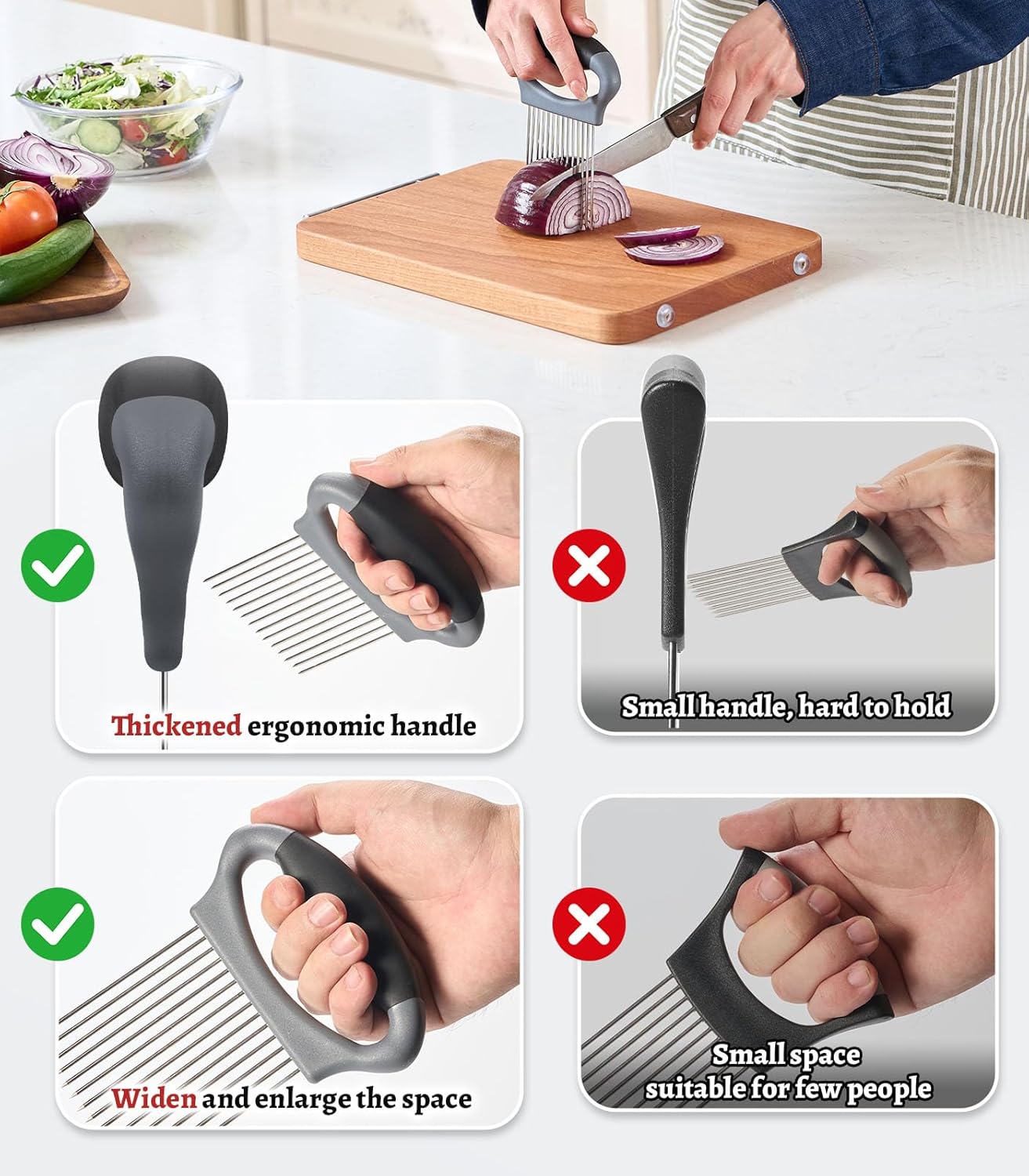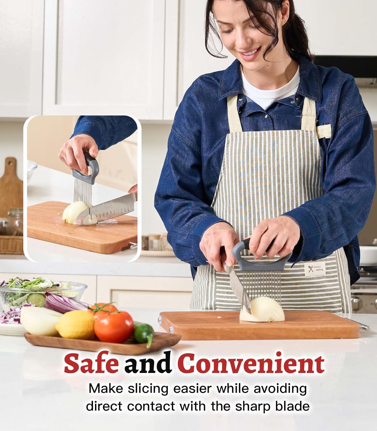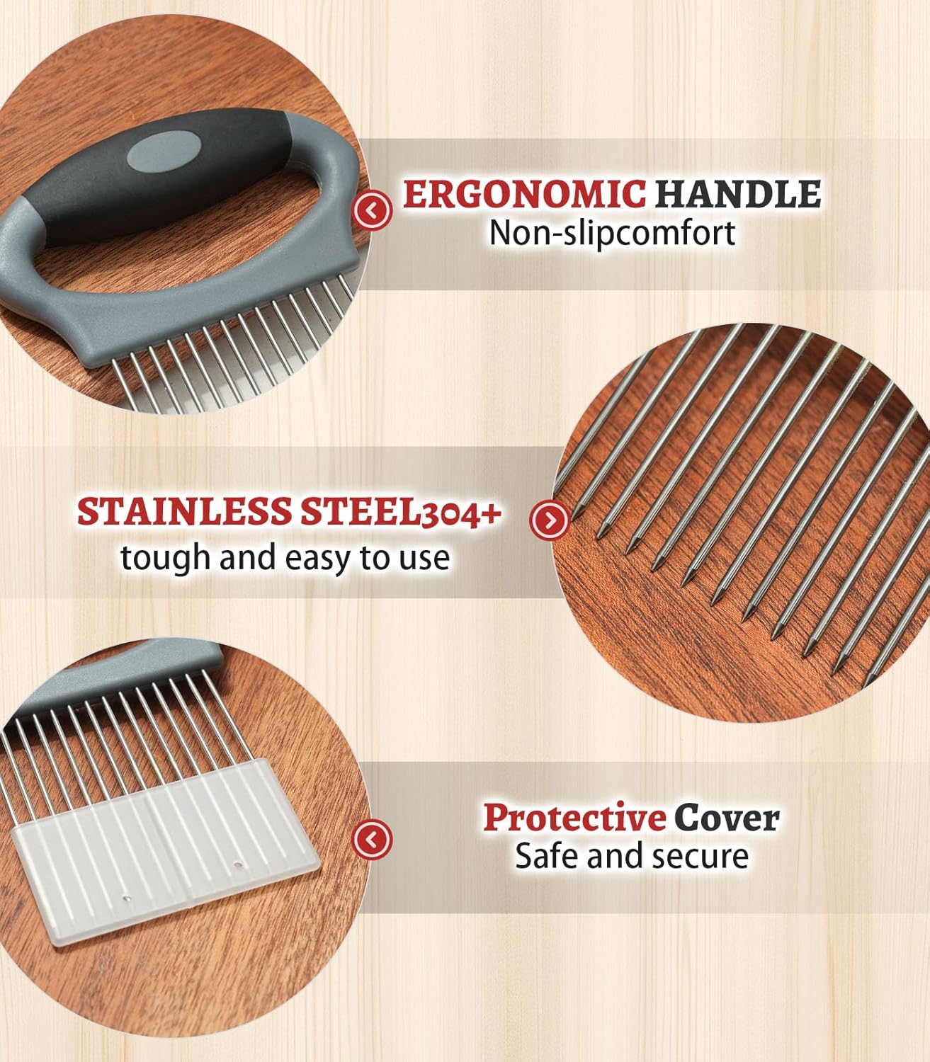 Premium Supplies – Crafted from premium stainless-steel, the onion slicer holder is constructed to resist the trials of day by day kitchen use, offering long-lasting sturdiness. The stainless-steel blade of this onion holder for slicing is rust-resistant, sustaining its pristine look even with frequent use. The non-porous nature of stainless-steel makes cleansing a breeze, guaranteeing comfort in your kitchen
