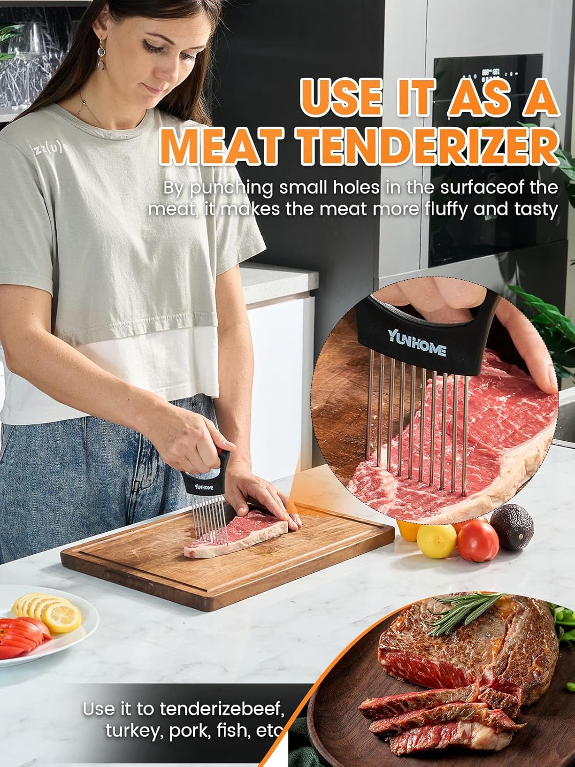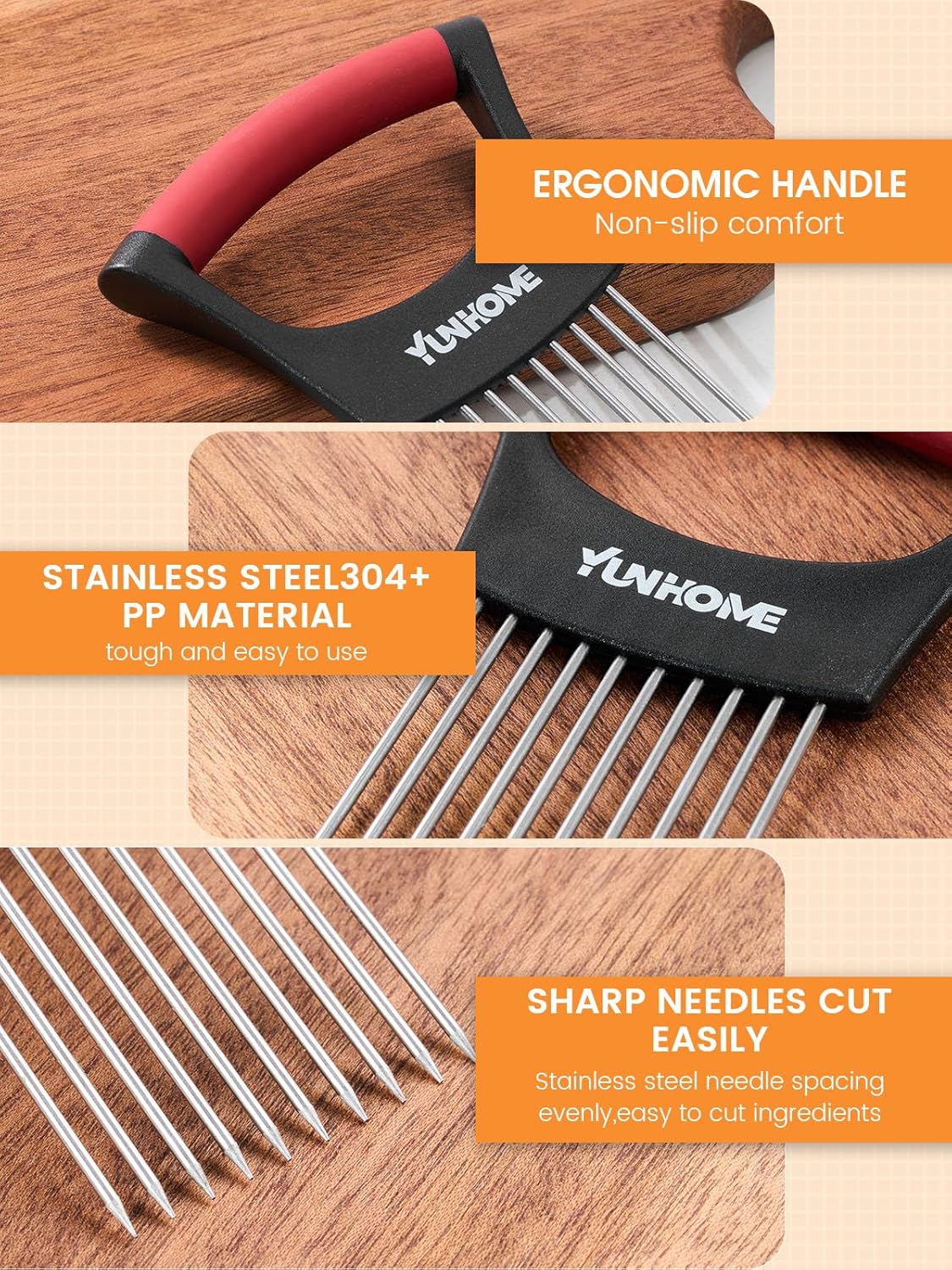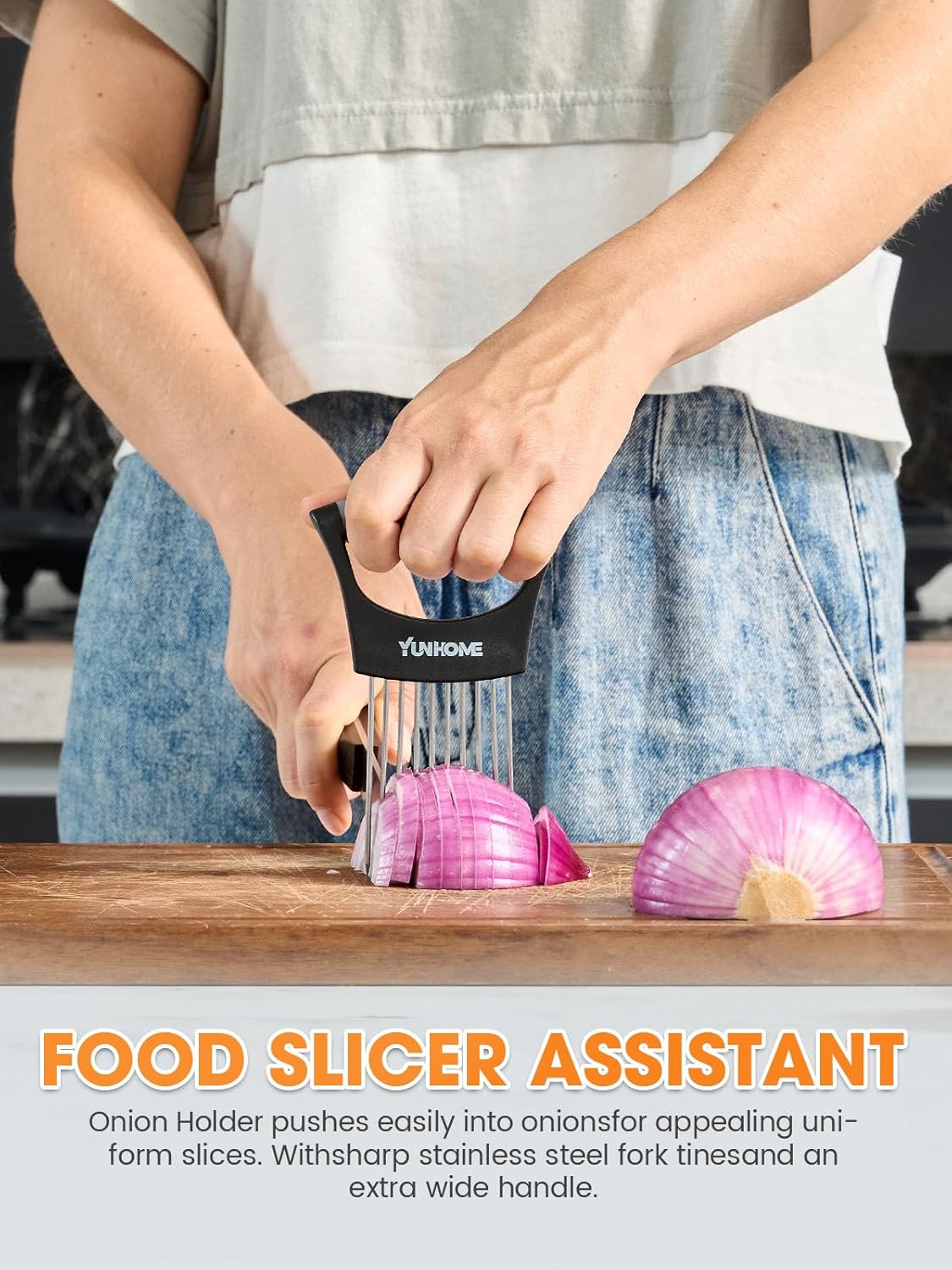 Multifunctional Slicer Instrument: YUNHOME Onion Holder Slicer includes a distinctive design with 10 stainless-steel forks underneath the deal with, making certain a safe grip and stopping slippage whereas slicing. It permits for even and exact slicing of onions, tomatoes, lemons, and meats. Providing a one-stop answer on your slicing wants.The design of this noin promotes uniform slicing, enhancing the presentation of your dishes and making certain even cooking for knowledgeable contact