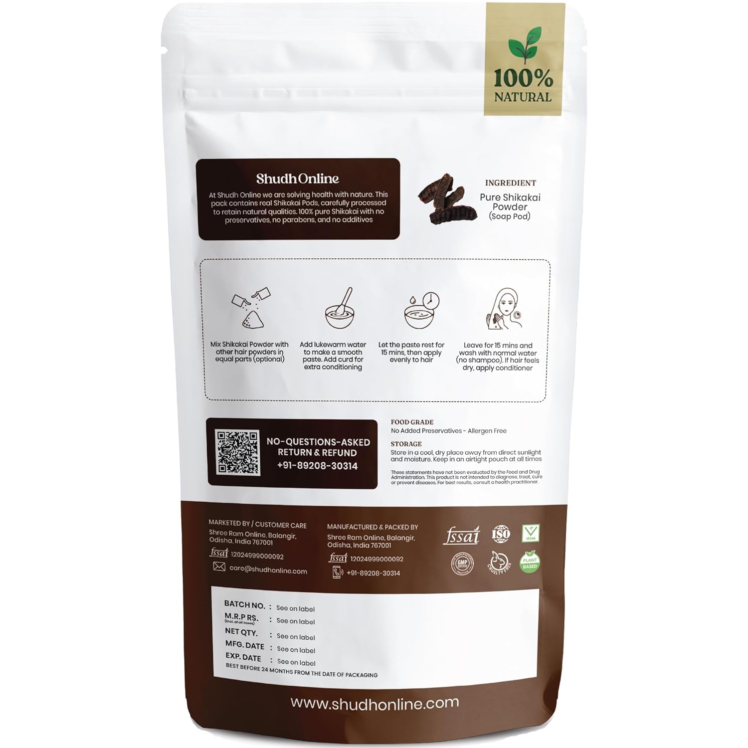 ORGANIC SHIKAKAI FOR HAIR – Comprised of 100% natural shakakai powder for hair processed from pure shikakai pods. Free from chemical substances and synthetic components, it retains the goodness of Acacia concinna for light cleaning.