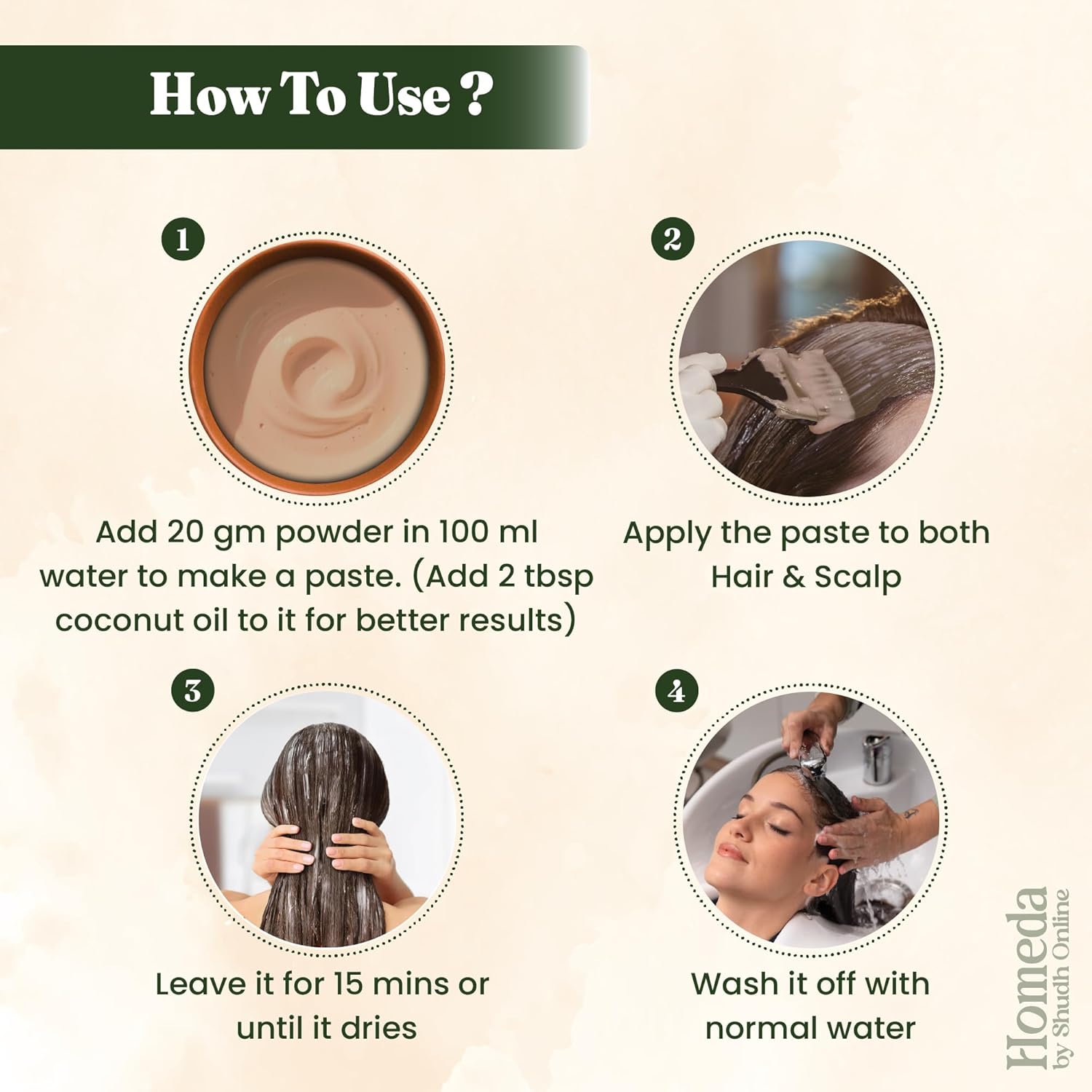 Mix the powder with water to create a paste, apply it to wet hair, and then rinse thoroughly.
