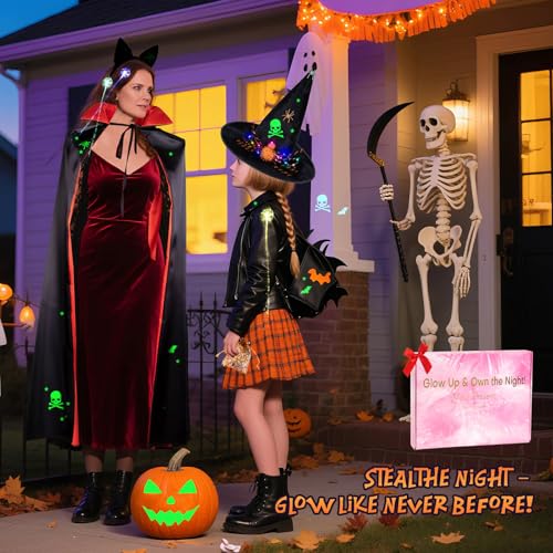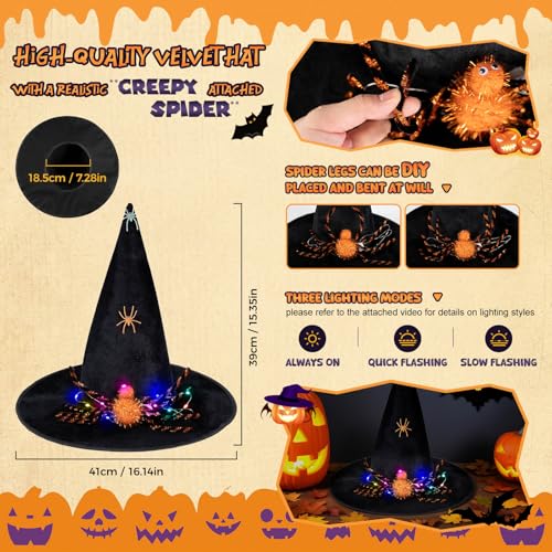 QDVDQ Halloween Costume,LED Spider Witch Hat & Reversible Cape Mild Up Outfit with Glow Stickers