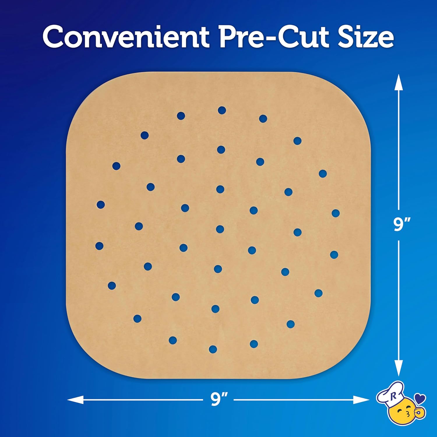 Package deal Contains: Fifty (50) Reynolds Kitchens Unbleached Parchment Air Fryer Liners, measuring 9 in. x 9 in. every