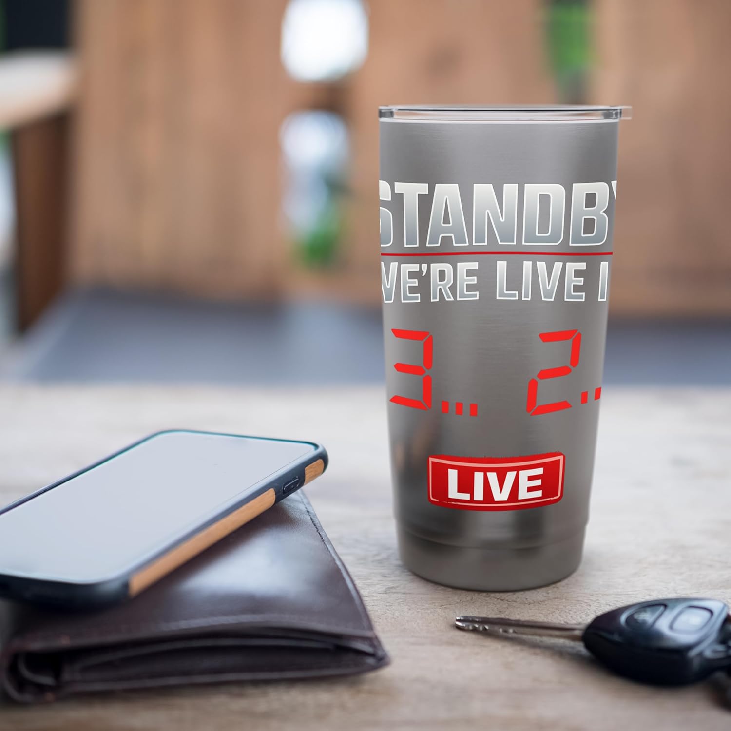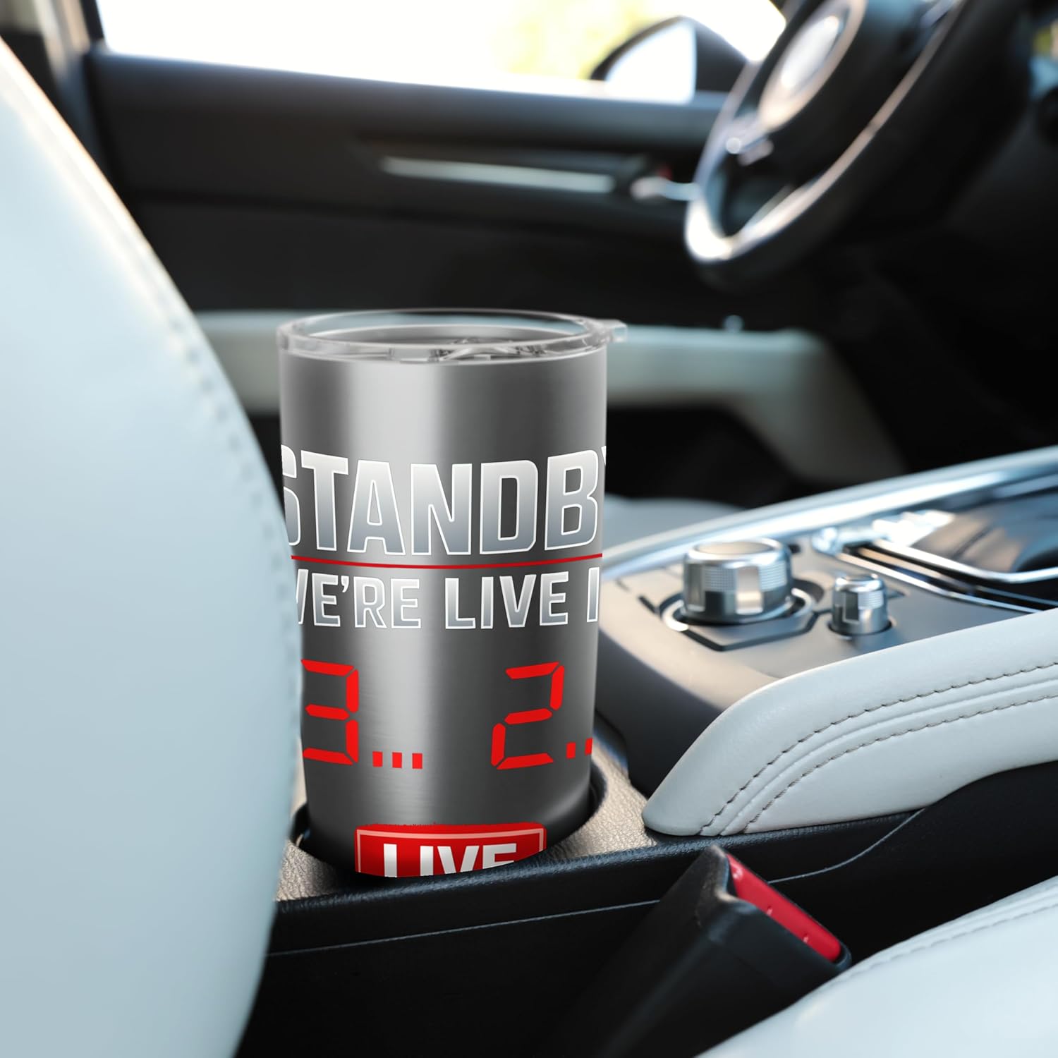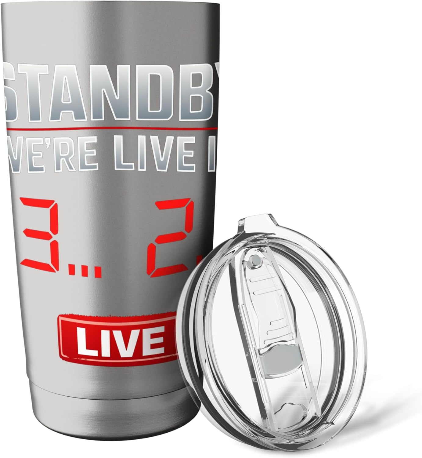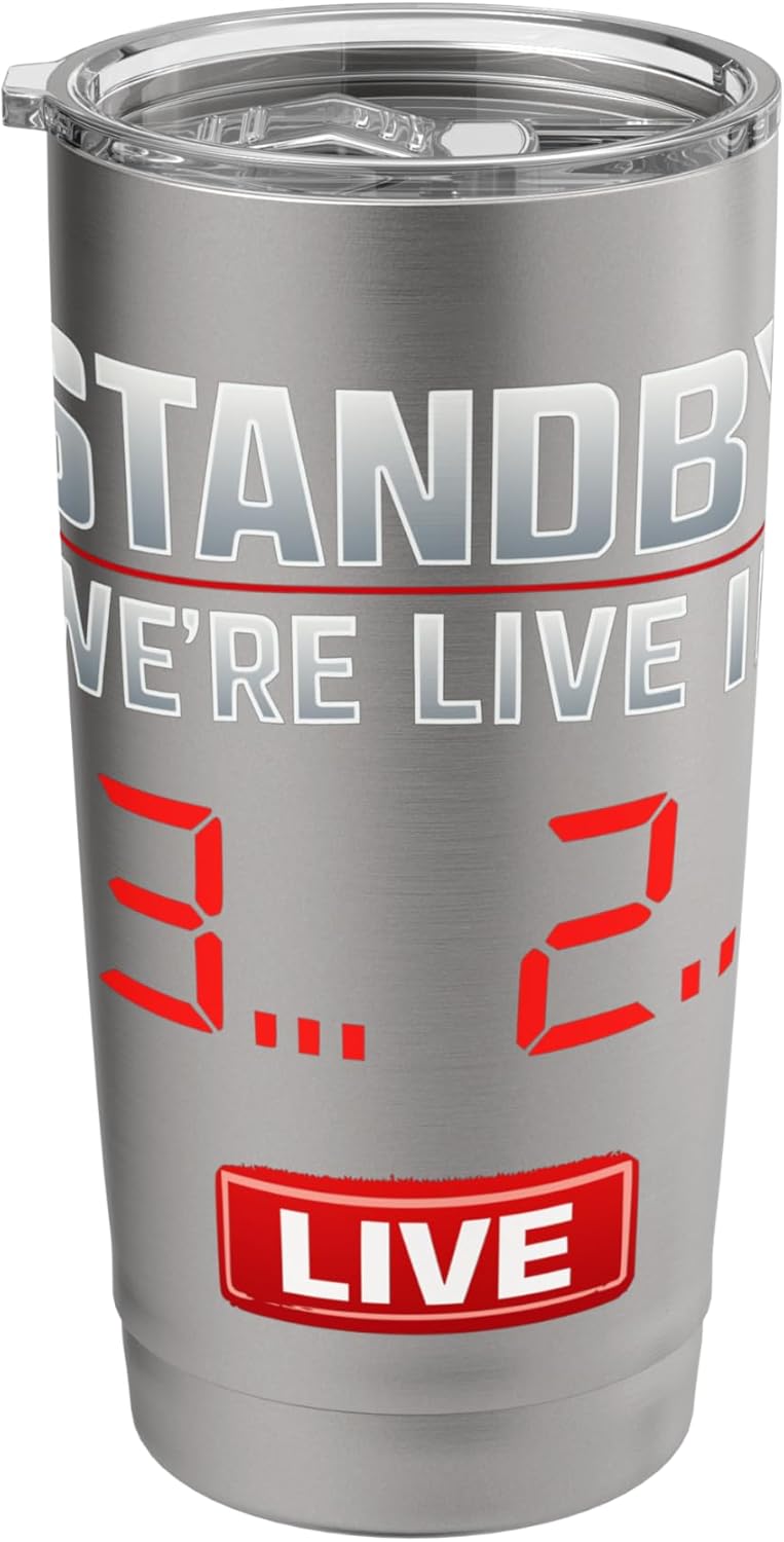 The tumbler features a design inspired by broadcast studio countdowns and modern streaming overlays, capturing the excitement of live events.